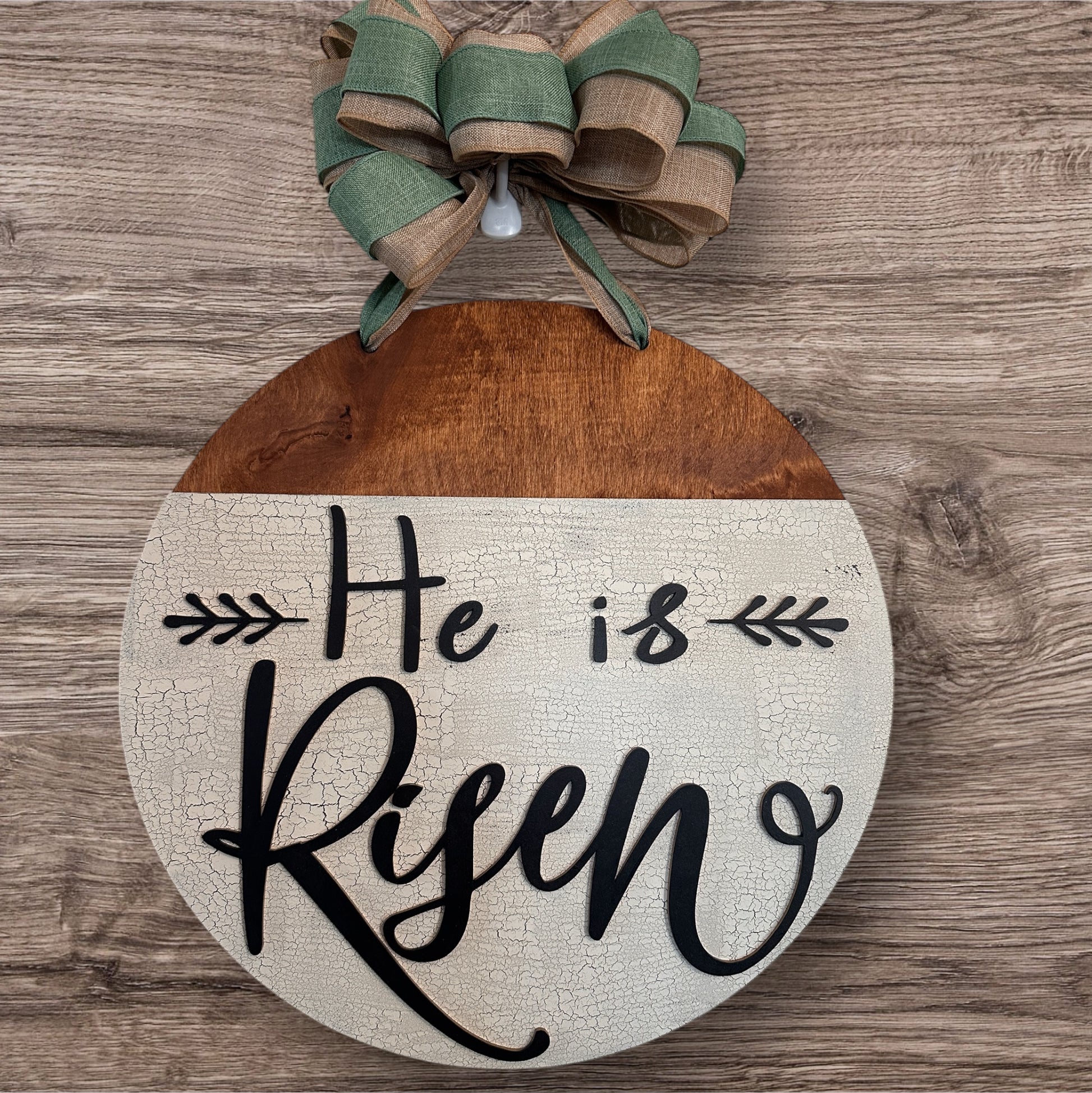 Display the true meaning of Easter this year with our 16" handmade He Is Risen door sign. Made from layered 1/4" hardwood plywood, each sign is lovingly crafted by hand in our shop. Signs feature natural hardwood stained finish, exterior grade polyurethane, and decorative bow for hanging. Signs have rubber bumpers on the back to prevent noise or marks on your door.